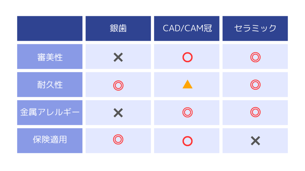 どの被せ物にするかお悩みの方は、それぞれの種類の特徴をよく理解した上で、歯科医師と相談し、ご検討いただければと思います。