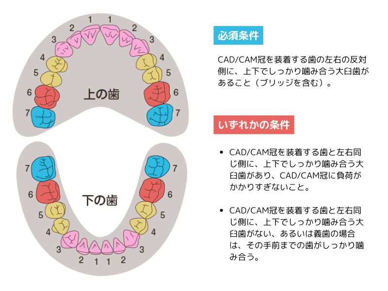 2024年6月の制度改訂により、CAD/CAM冠を第二大臼歯(7番の歯)、第三大臼歯(8番の歯/親知らず)にも保険適用で使えるようになりました。(一部条件があります)