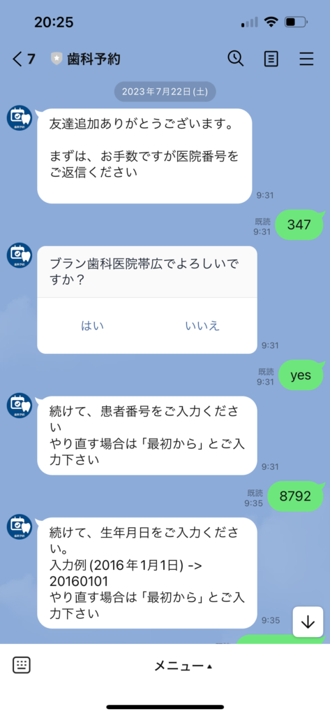 初診時にお渡しする診察券に記載されている患者番号を入力します。